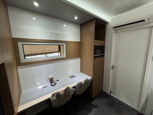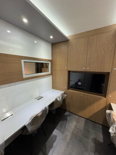 In addition to its optimized layout for practical use, the space is fully functional, featuring integrated amenities such as a built-in refrigerator and microwave for added convenience during long sessions.