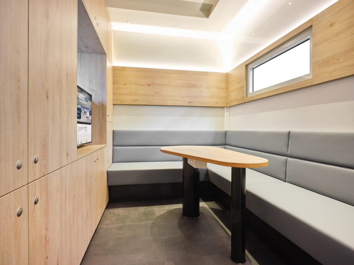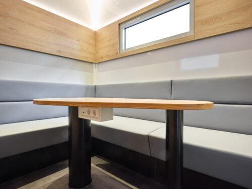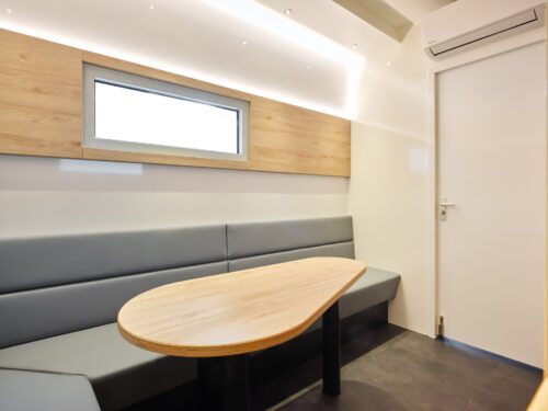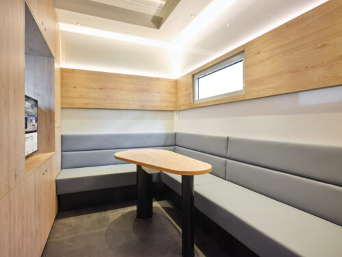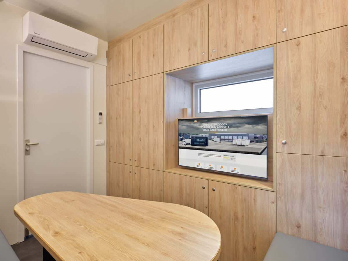 The Grand Prix office has a comfortable L-shaped sofa, a solid table and a smart TV. The trailer will fit 4 cars, has an adjustable 2nd deck and side door with 3-point lock